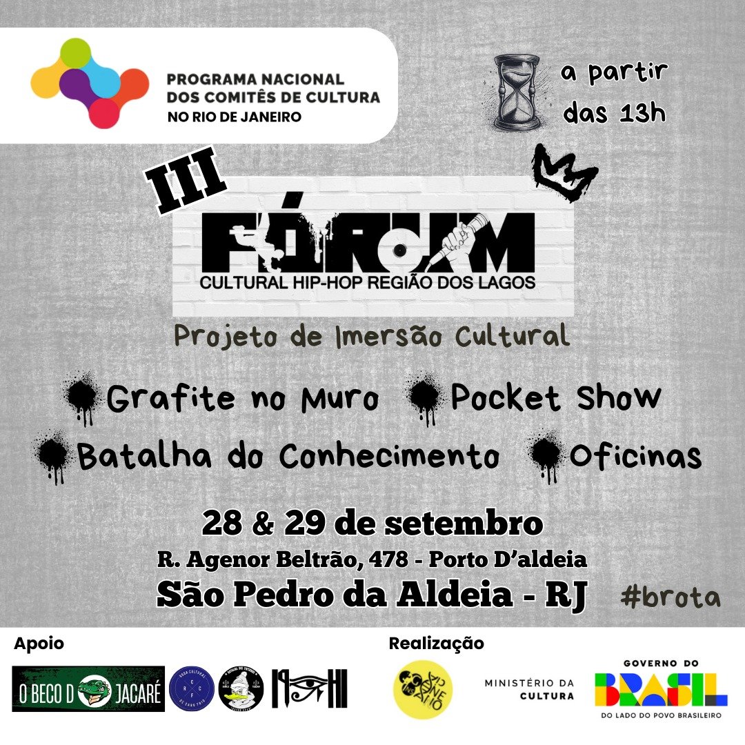 O Fórum de Hip Hop e o Comitê de Cultura da Região dos Lagos convidam a todos para o 3º Fórum Cultural de Hip Hop, que ocorrerá nos dias 28 e 29 de setembro, no Beco do Jacaré, em São Pedro da Aldeia.