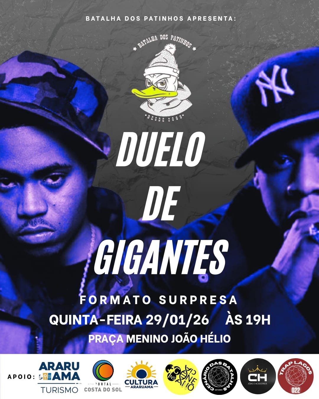 A cultura urbana vai tomar conta da Praça Menino João Hélio, em Araruama, nesta quinta-feira, dia 29, a partir das 19h, com a edição especial do Projeto Duelo de Gigantes, promovida pela Batalha dos Patinhos.