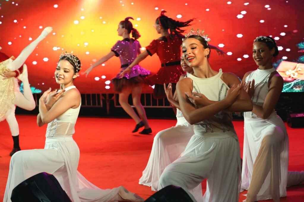 A programação começou às 19h, quando o público foi recebido pelo Quarteto Estêvam. O som suave do violino trouxe ao ar clássicos natalinos, preparando o clima para uma noite inesquecível. Em seguida, o palco se encheu de movimento, cor e energia com o espetáculo “Natal Dançante”, apresentado pelo Ballet Bruna Marinho, que arrancou aplausos da plateia.