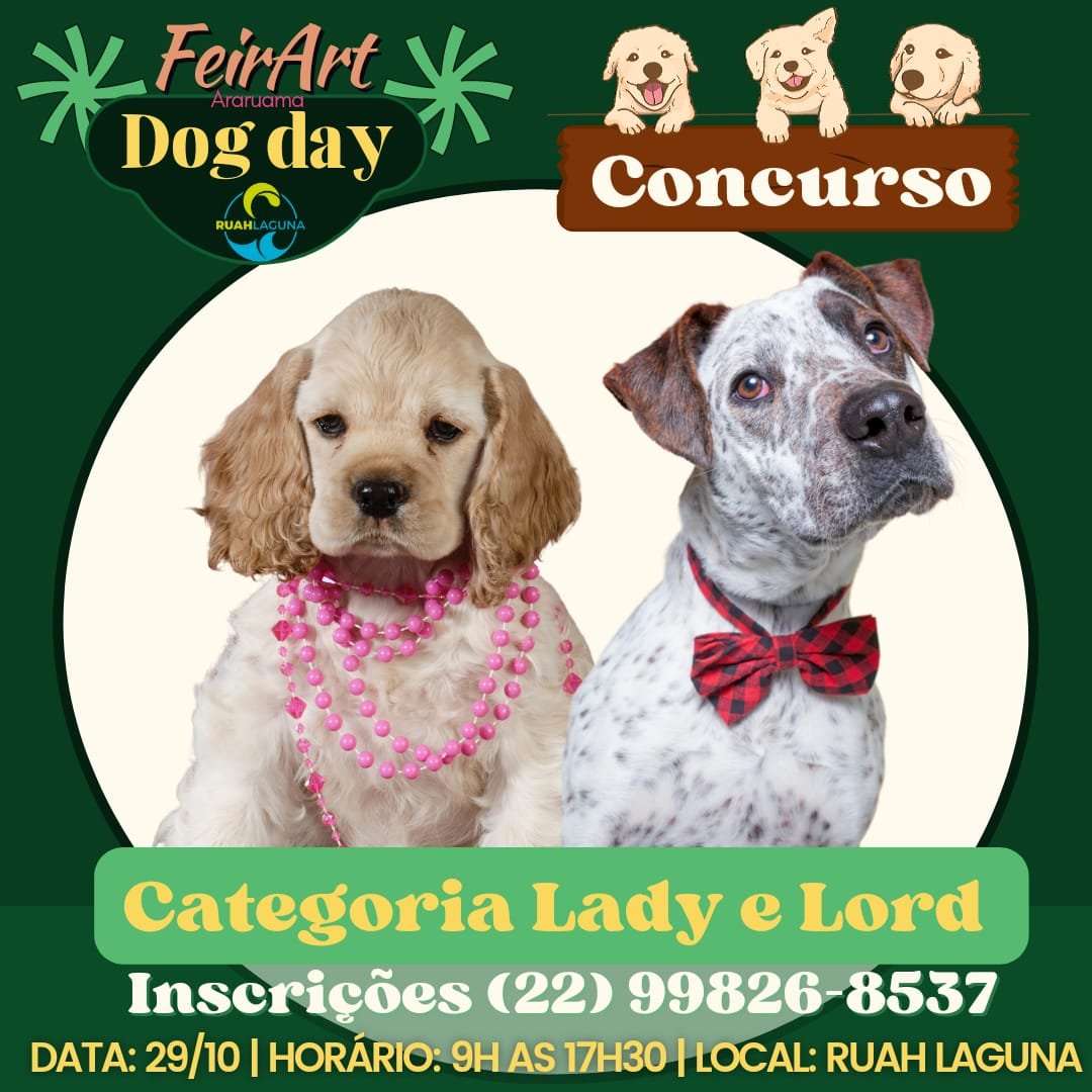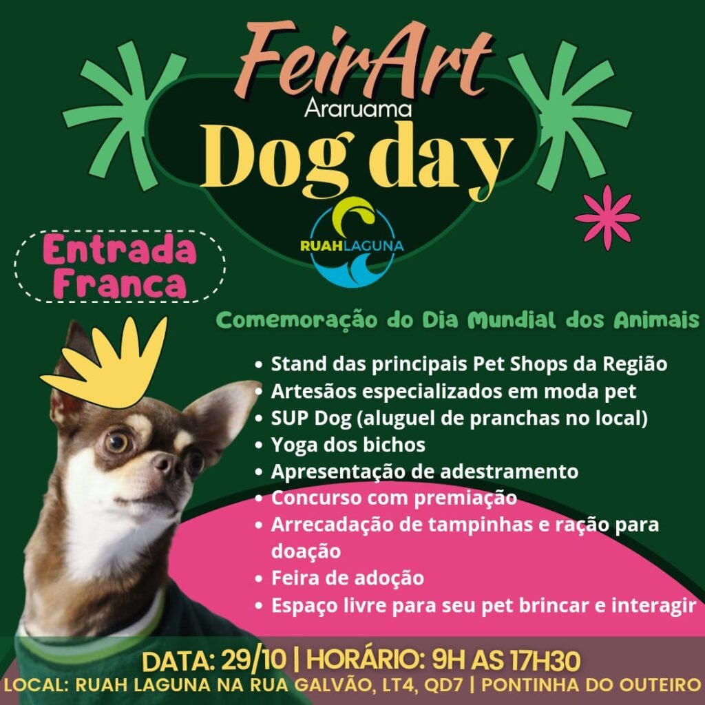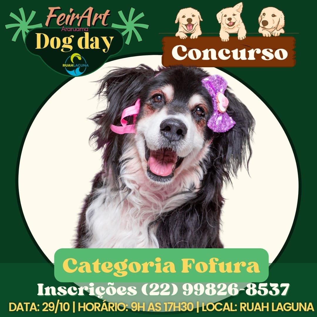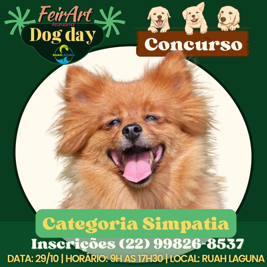 O 1° Dog Day da FeirArt vai reunir concurso de cachorros, feira, diversão e caridade em sua primeira edição. O evento será amanhã (29/10), das 9h às 17h30 no Ruah Laguna na Pontinha do Outeiro em Araruama.