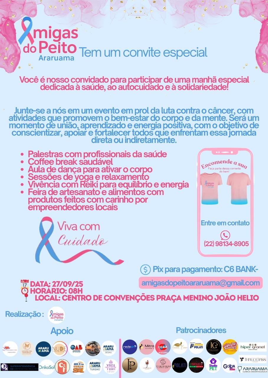 No próximo dia 27 de setembro, às 8h, o Centro de Convenções Praça Menino João Hélio, em Araruama, será palco de uma manhã dedicada à saúde, ao autocuidado e à solidariedade. O evento é promovido pelo projeto “Amigas do Peito” e conta com o apoio da Rádio Costa do Sol FM.