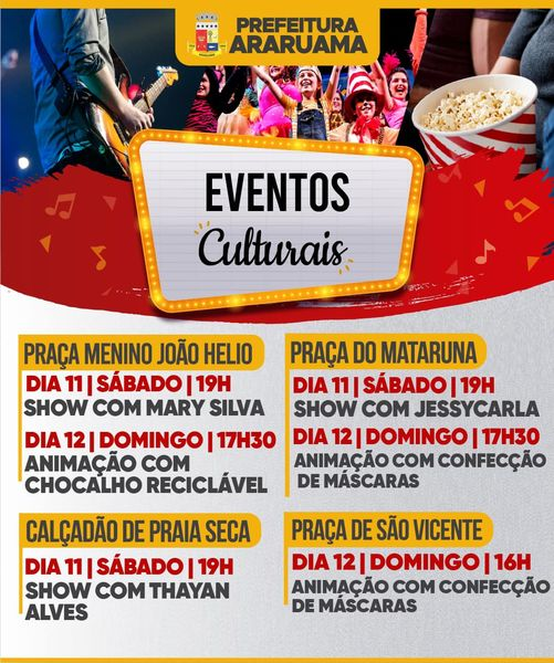 A Prefeitura de Araruama divulgou a programação cultural das praças e locais de evento da cidade.