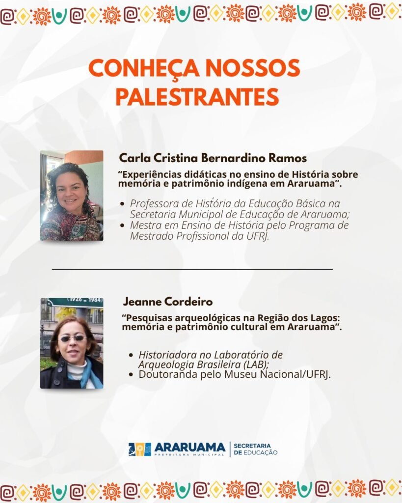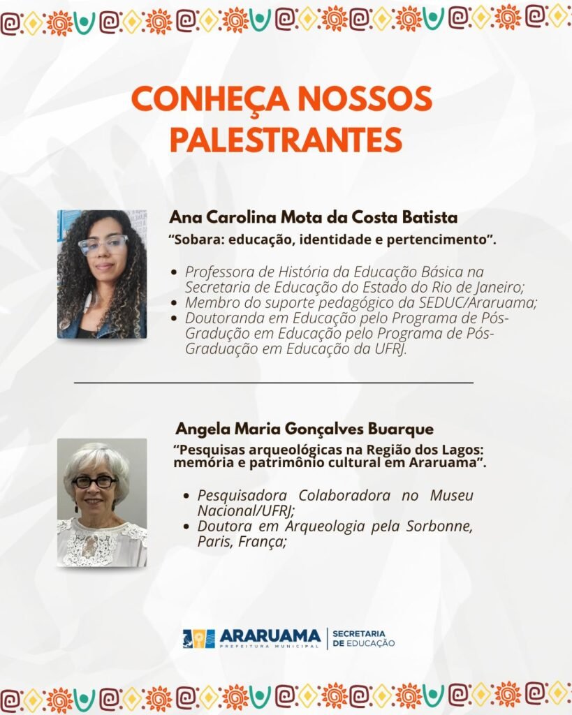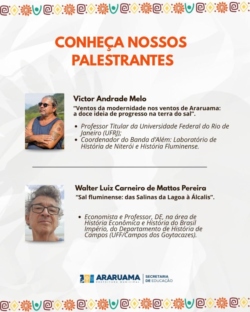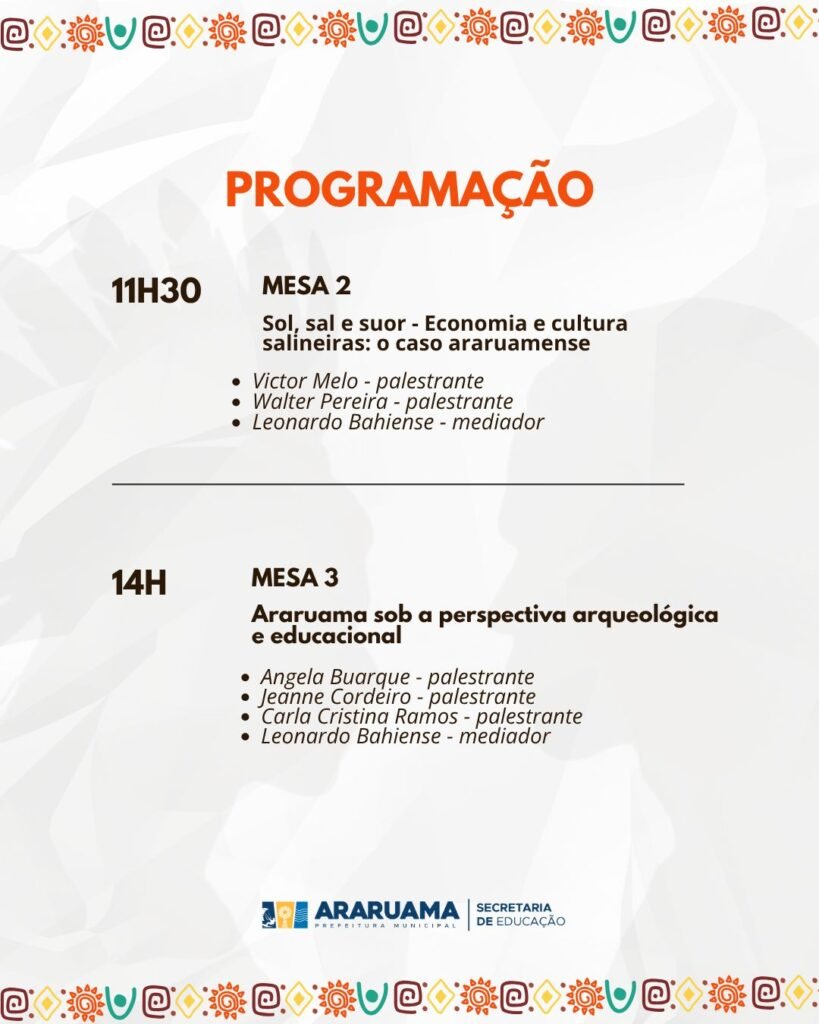Ao longo do dia, o público poderá acompanhar uma programação completa de palestras, mesas temáticas e debates conduzidos por especialistas convidados, que trarão novas perspectivas sobre a formação cultural, social e histórica de Araruama.