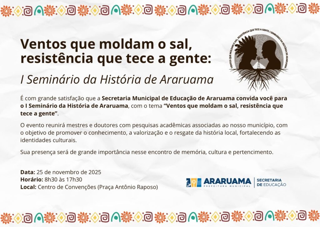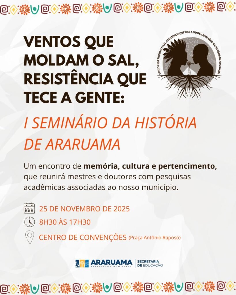 No dia 25 de novembro, Araruama sediará o I Seminário da História de Araruama, com o tema “Ventos que moldam o sal, resistência que tece a gente”. O evento reunirá mestres, doutores e pesquisadores dedicados ao estudo e à valorização das raízes históricas do município, promovendo um importante espaço de conhecimento, reflexão e preservação da identidade local.