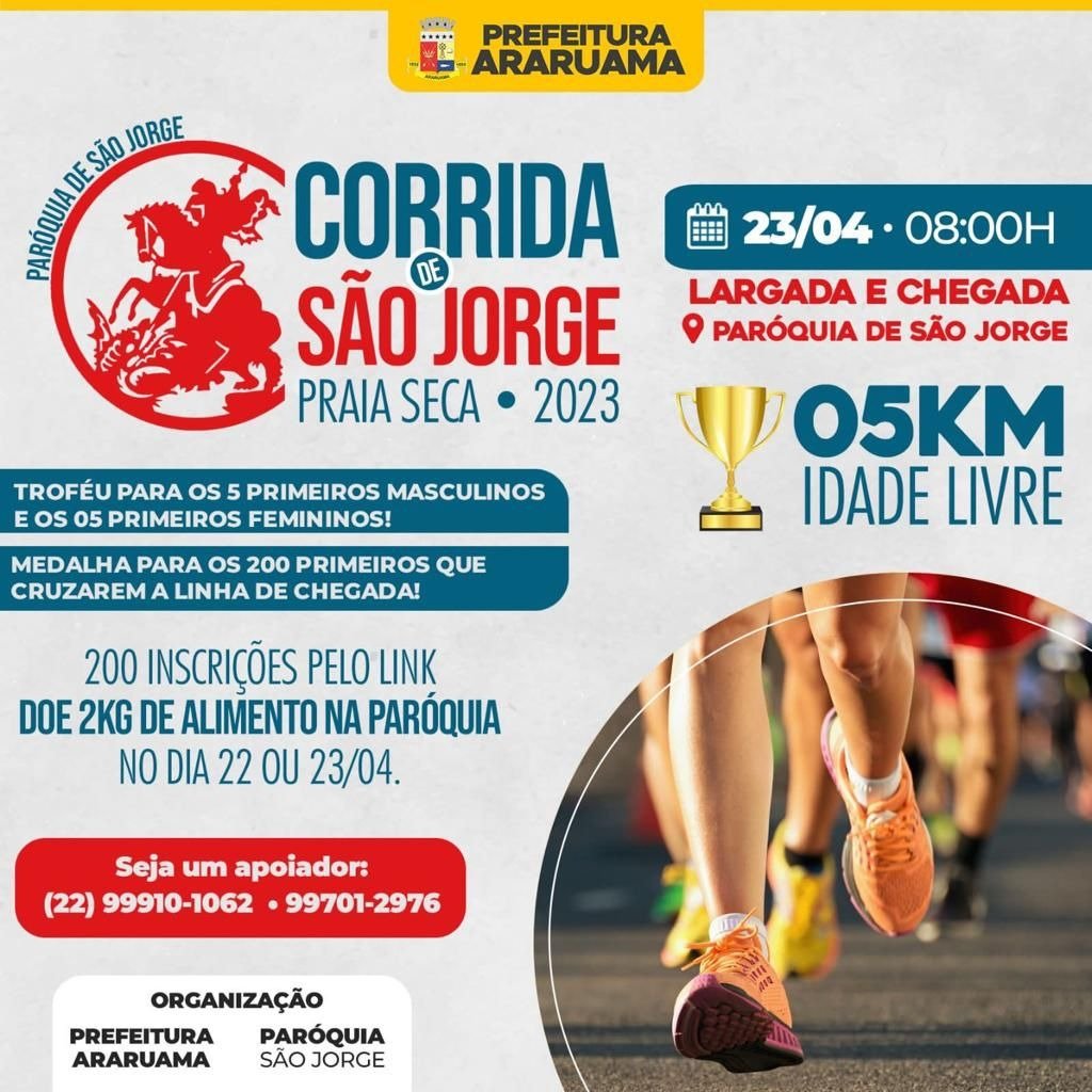 A Prefeitura de Araruama, por meio da Secretaria de Turismo, Cultura e Desenvolvimento Econômico, juntamente com a Paróquia São Jorge vão realizar a Corrida de São Jorge no distrito de Praia Seca.