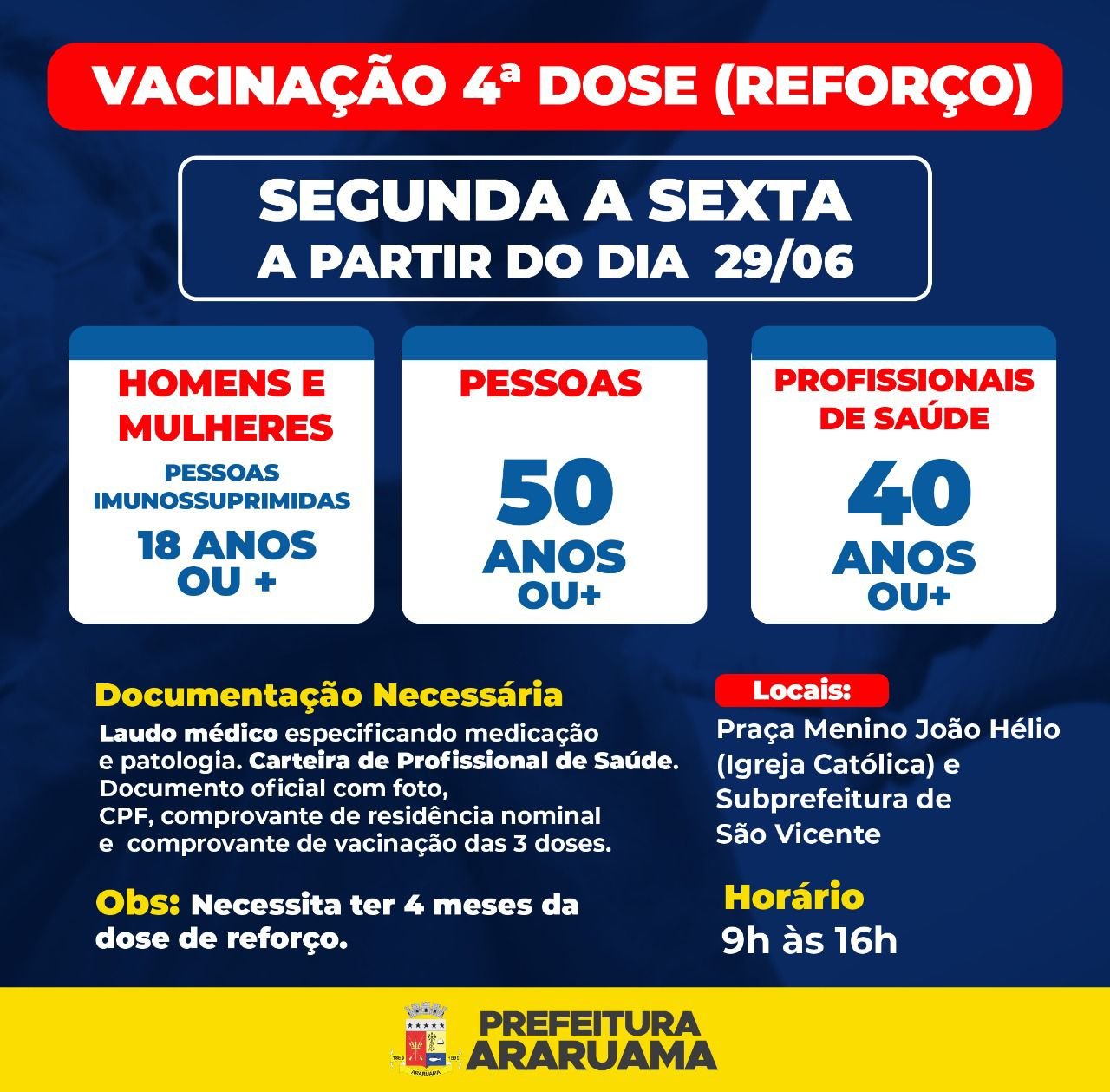 A Prefeitura de Araruama, por meio da Secretaria da Saúde, vai iniciar a vacinação da quarta dose contra a COVID-19 em pessoas com 50 anos ou mais, profissionais da saúde dos setores público e privado com 40 anos ou mais e também pacientes com alto grau de imunossupressão a partir de 18 anos.