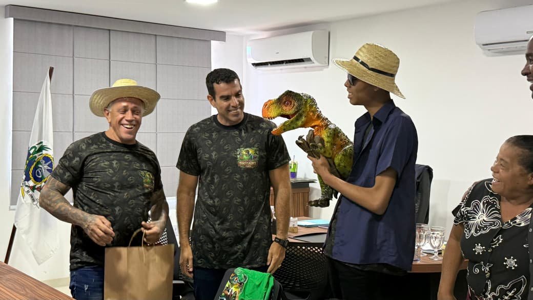 Mascote da Ilha dos Dinossauros visita o prefeito Fabinho Costa e inicia tour pelas escolas de Iguaba Grande