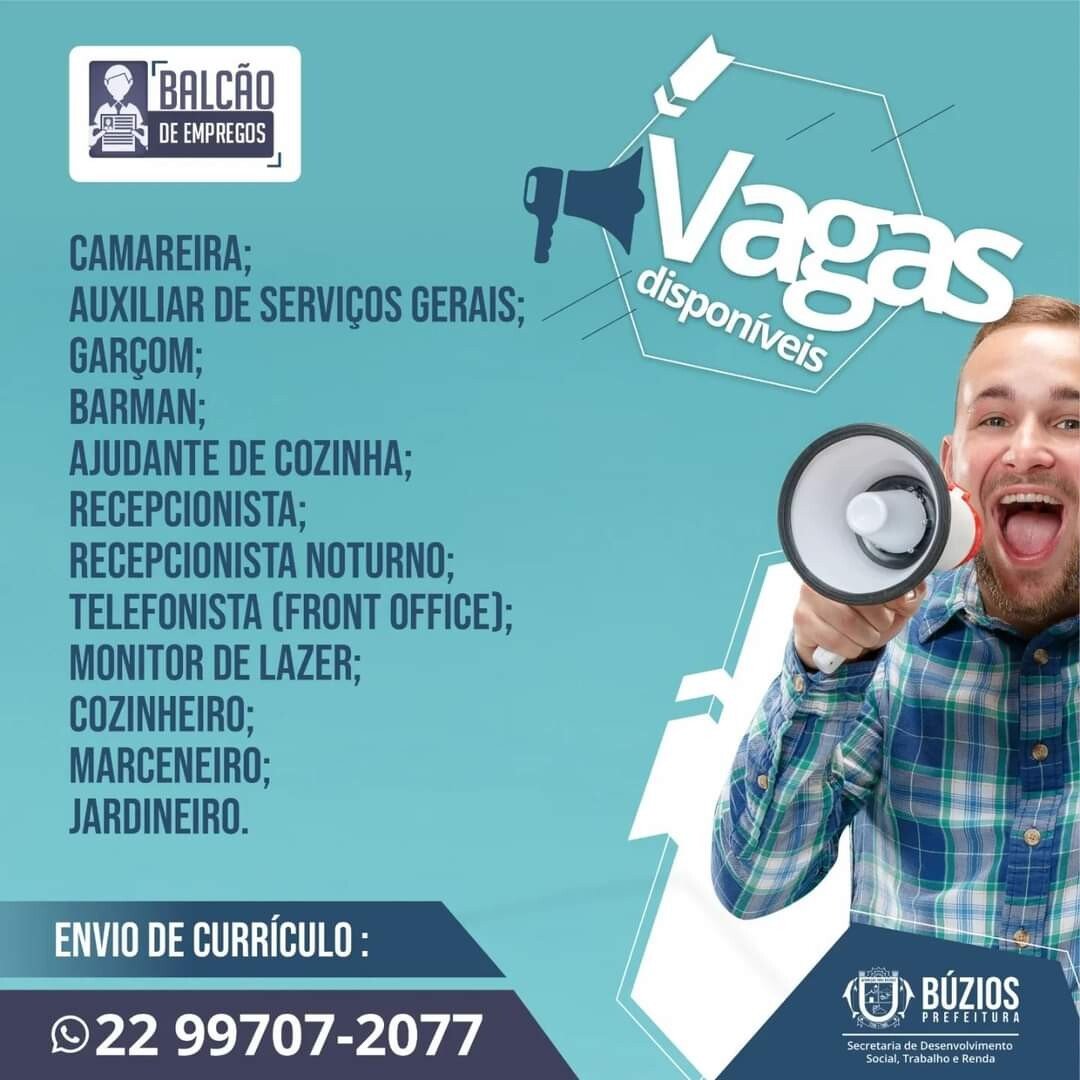A Secretaria de Desenvolvimento Social, Trabalho e Renda de Armação dos Búzios, por meio da coordenadoria de Trabalho e Renda (Balcão de Empregos) disponibiliza novas vagas para contratação.