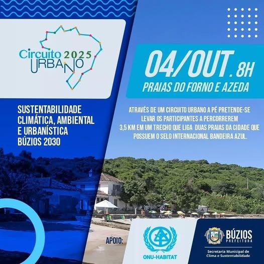 A Prefeitura de Búzios, por meio da Secretaria do Clima e Sustentabilidade, realiza no próximo dia 4 de outubro, às 8h, o Circuito Urbano 2025, iniciativa que conecta a Praia do Forno à Praia da Azeda em uma caminhada de 3,5 km. Com o tema “Sustentabilidade Ambiental e Urbanística Búzios...