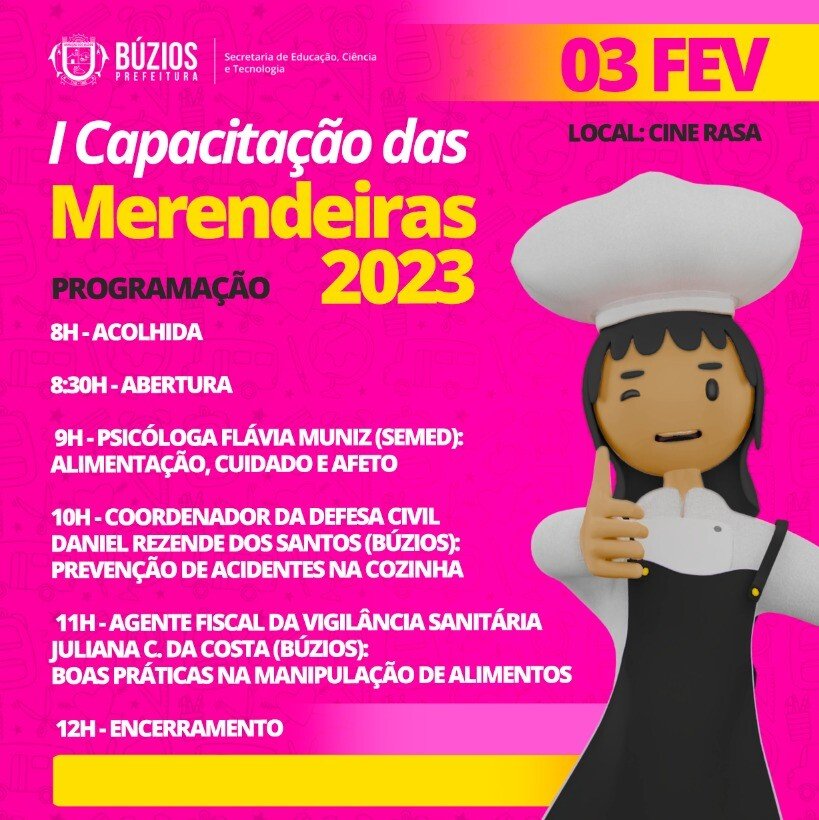 A Secretaria de Educação, Ciência e Tecnologia de Armação dos Búzios, por meio do Departamento de Infraestrutura, sob a gerência de Alimentação Escolar, realizará nesta sexta-feira (03), a I Capacitação das Merendeiras – 2023, às 8h, no Cine Rasa.