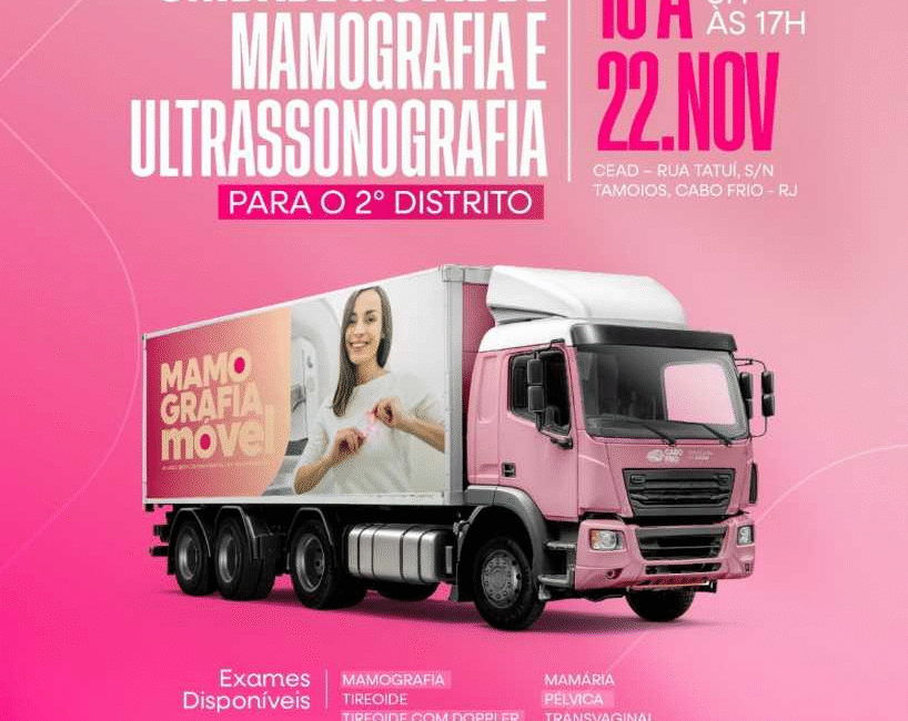 A Secretaria Municipal de Saúde de Cabo Frio, em parceria com a Secretaria Estadual de Saúde, vai oferecer, do dia 13 a 22 de novembro, diversos exames gratuitos na Unidade Móvel de Mamografia e Ultrassonografia.