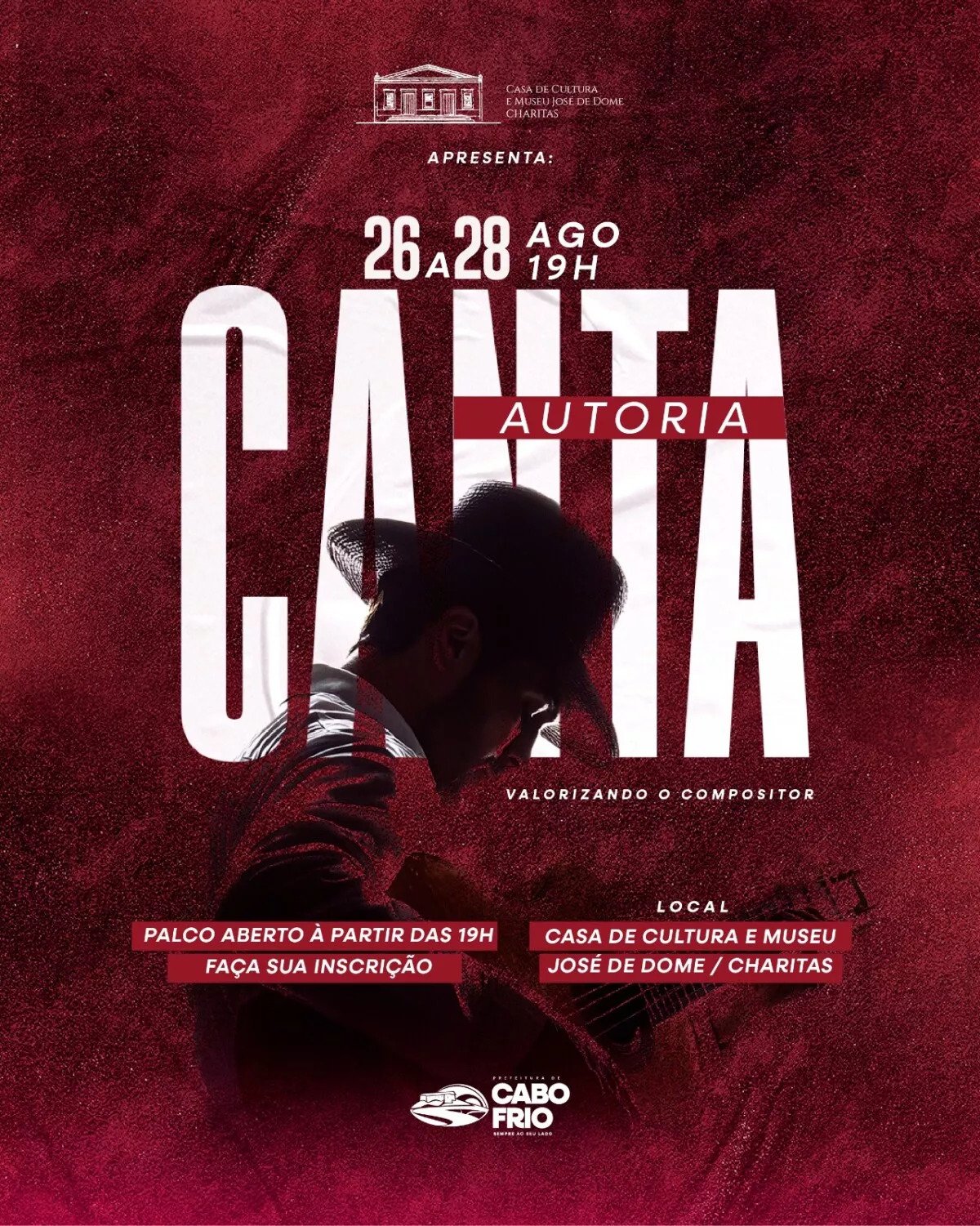 O Museu e Casa de Cultura José de Dome – Charitas, em Cabo Frio, será palco de três noites dedicadas à música autoral e à valorização dos artistas locais. O festival “Canta Autoria” acontece entre os dias 26 e 28 de agosto, sempre a partir das 19h, no jardim do espaço cultural.