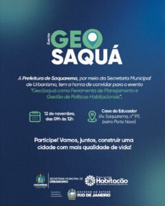 A Prefeitura de Saquarema, por meio da Secretaria Municipal de Urbanismo, realizará no dia 12 de novembro, das 9h às 12h, o evento “GeoSaqüá como Ferramenta de Planejamento e Gestão de Políticas Habitacionais”, que acontecerá na Casa do Educador, localizada na Avenida Saquarema, nº 911, bairro Porto Novo. A iniciativa...
