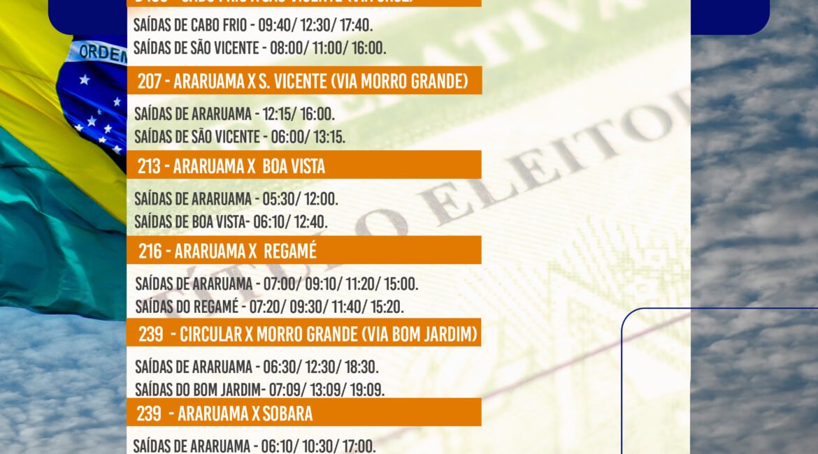 O Grupo Salineira definiu a realização de uma operação especial no transporte coletivo de algumas cidades da Região dos Lagos para este domingo (2), ocasião em que ocorrem as eleições nacionais. Para atender ao público que vai votar, horários extras serão ofertados nas áreas que necessitam de um reforço por conta da demanda de passageiros: