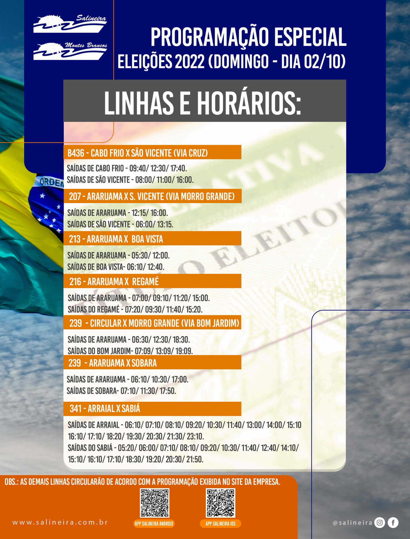 Em caso de necessidade, serão disponibilizados mais ônibus para atendimento da população. A empresa terá uma equipe de plantão para adequar a frota conforme a necessidade. Para informações detalhadas sobre os horários e itinerários disponibilizados, os clientes podem consultar no site www.salineira.com.br, no aplicativo “Salineira” ou no canal de atendimento Fale Ônibus 0800 886 1000.