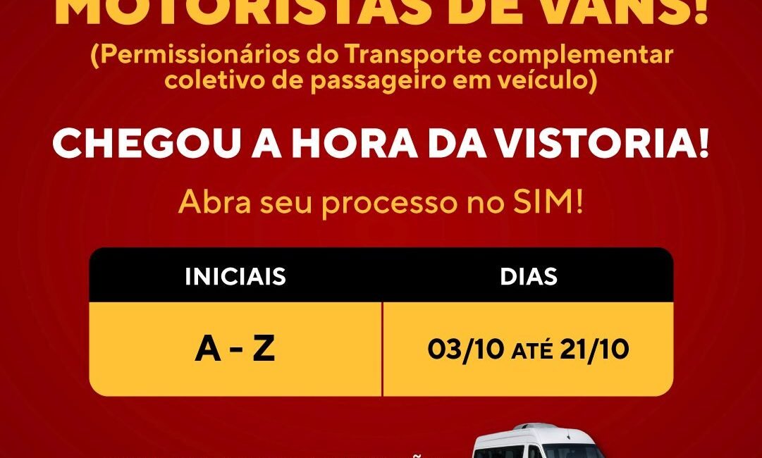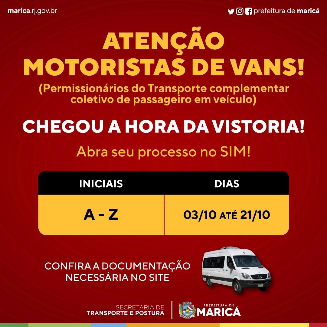 O município de Maricá, por meio da Secretaria de Transportes, inicia na segunda-feira (03) a vistoria das vans que fazem transporte coletivo de passageiros no município, e deve ser realizada até o dia 21/10. Para a abertura do processo de renovação da licença, o permissionário deve se dirigir ao setor de protocolo dos Serviços Integrados Municipais (SIM) do Centro, das 08h às 17h com os documentos listados abaixo.