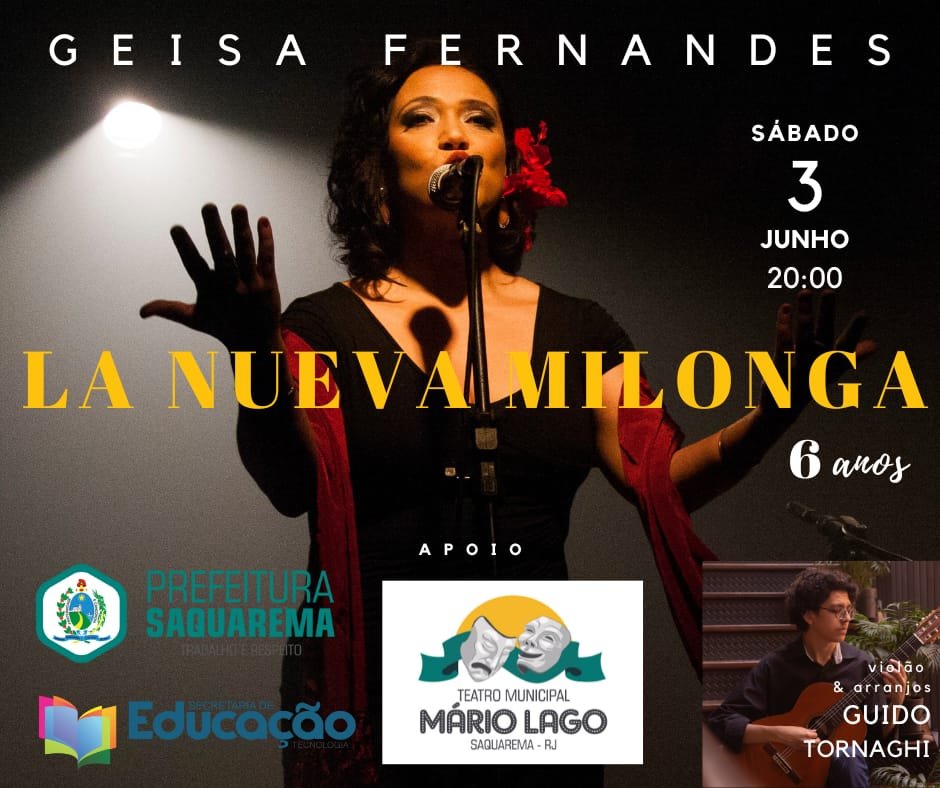 No sábado, dia 03 de junho, às 20 horas, o Teatro Municipal Mário Lago receberá o espetáculo “La Nueva Milonga: Tango e Música Popular Brasileira”, com a cantora e compositora Geisa Fernandes que apresentará a trajetória do tango e sua influência na música popular brasileira. Repleto de histórias e curiosidades, “La Nueva Milonga…” passeia por tangos consagrados, como “A Media Luz” e “Mano a Mano”; e clássicos brasileiros, como “Pelo Telefone” e “Jura”, e apresenta uma versão inédita para “Cama e Mesa”, sucesso na voz de Roberto Carlos.