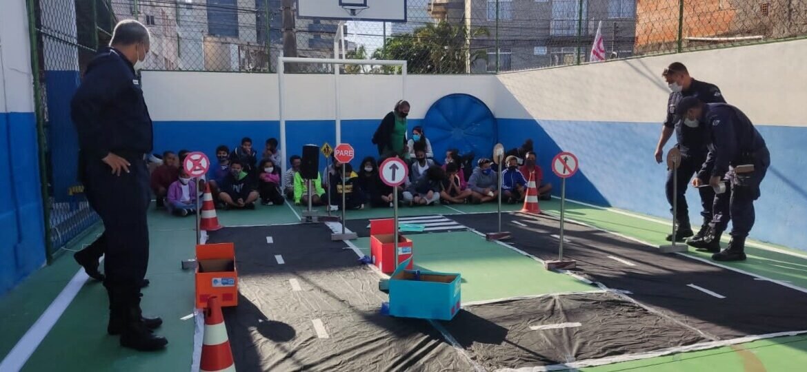 Em visita à unidade escolar, a equipe realizou uma dinâmica com as turmas do turno da manhã e da tarde, onde foram apresentadas placas, o semáforo e toda a vivência no trânsito, como o momento de travessia e os locais que são proibidos, por meio de placas ou não.