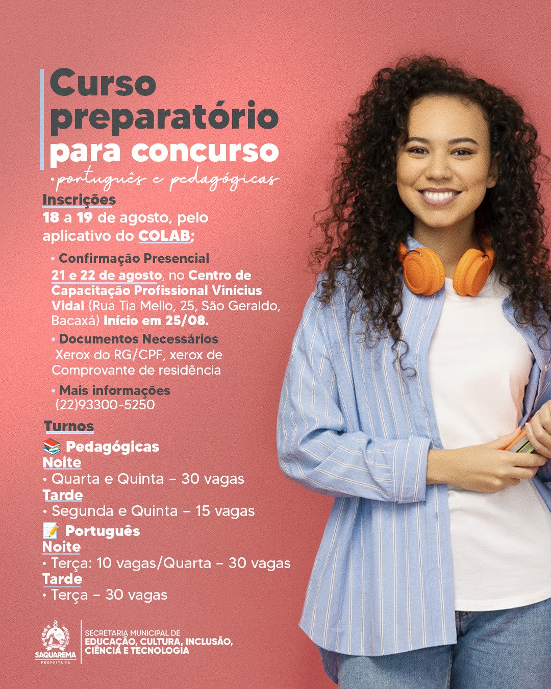 A Prefeitura de Saquarema, por meio da Secretaria Municipal de Educação, Cultura, Inclusão, Ciência e Tecnologia, abre inscrições para o Curso Preparatório para Concurso – Português e Pedagógicas, oferecendo aulas gratuitas para candidatos que desejam ampliar seus conhecimentos e se preparar para processos seletivos.