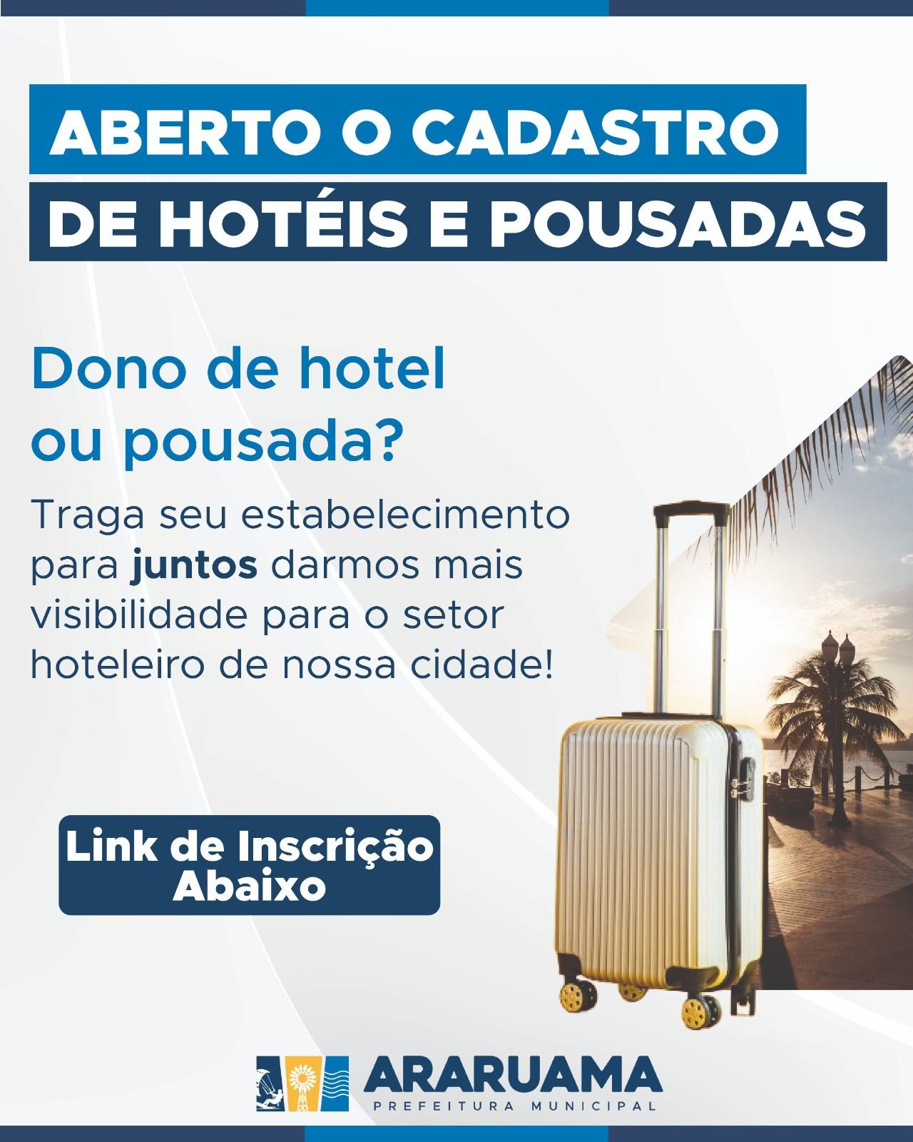 A Prefeitura de Araruama, por meio da Secretaria Municipal de Turismo e Desenvolvimento Econômico, está convidando os donos de hotéis e pousadas da cidade a realizarem seu cadastro para integrar a rede oficial de divulgação do município. A iniciativa tem como objetivo valorizar o setor hoteleiro, fortalecer ainda mais o turismo local e ampliar a visibilidade dos meios de hospedagem que contribuem para o desenvolvimento econômico da região.