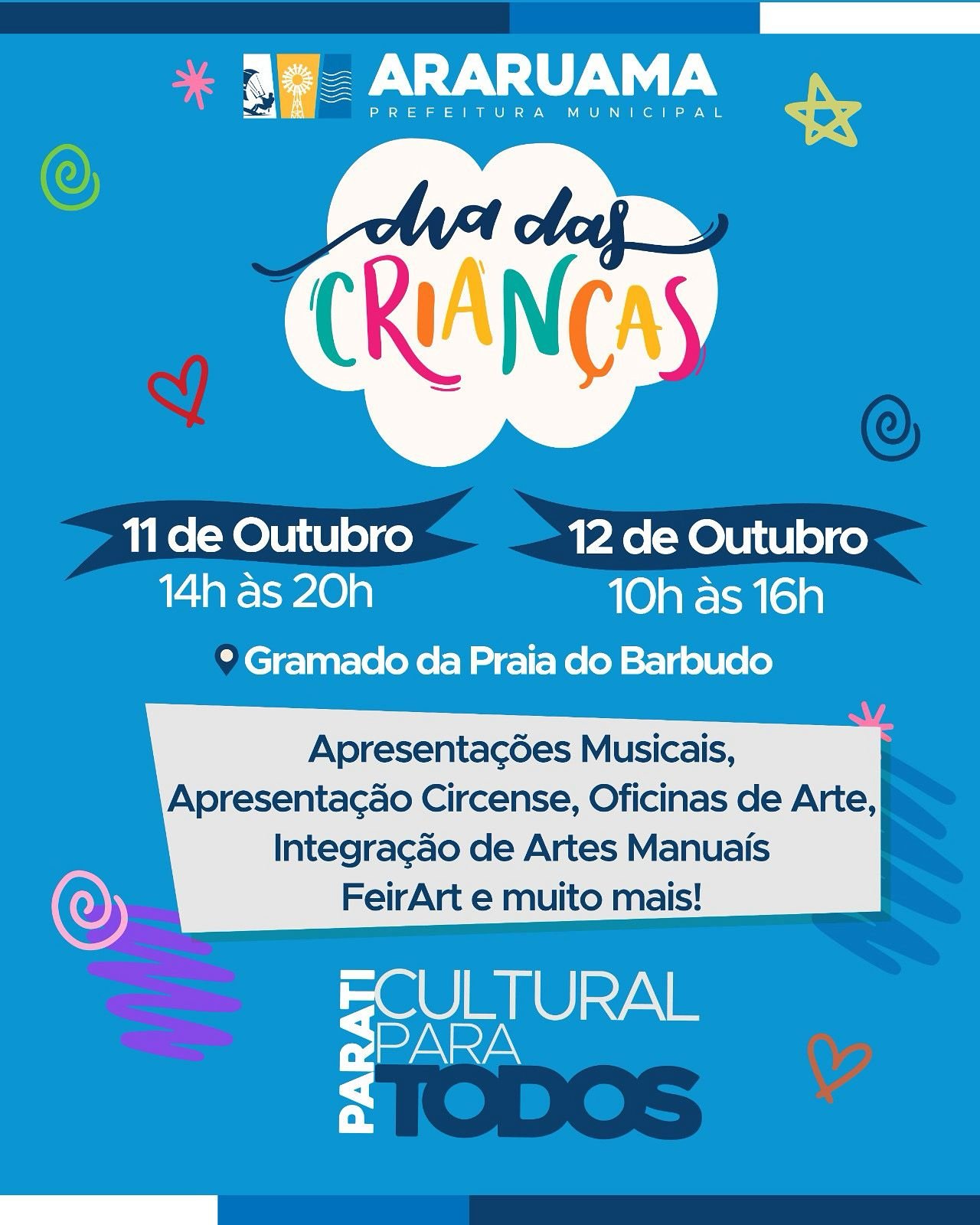 A Prefeitura de Araruama, por meio da Secretaria Municipal de Cultura, preparou uma programação especial em comemoração ao Dia das Crianças, que será realizada no gramado da Praia do Barbudo, no bairro Parati, nos dias 11 e 12 de outubro.