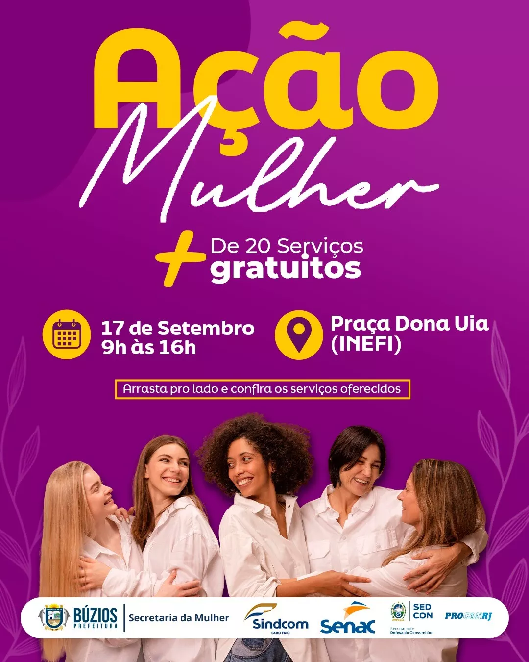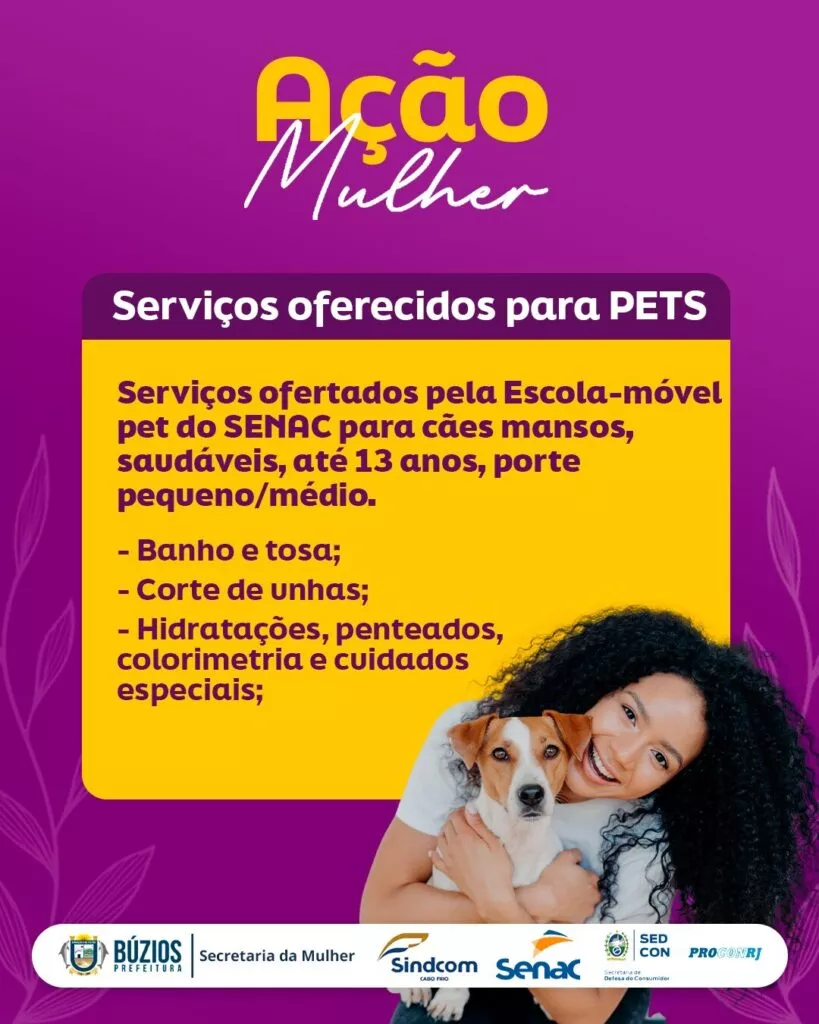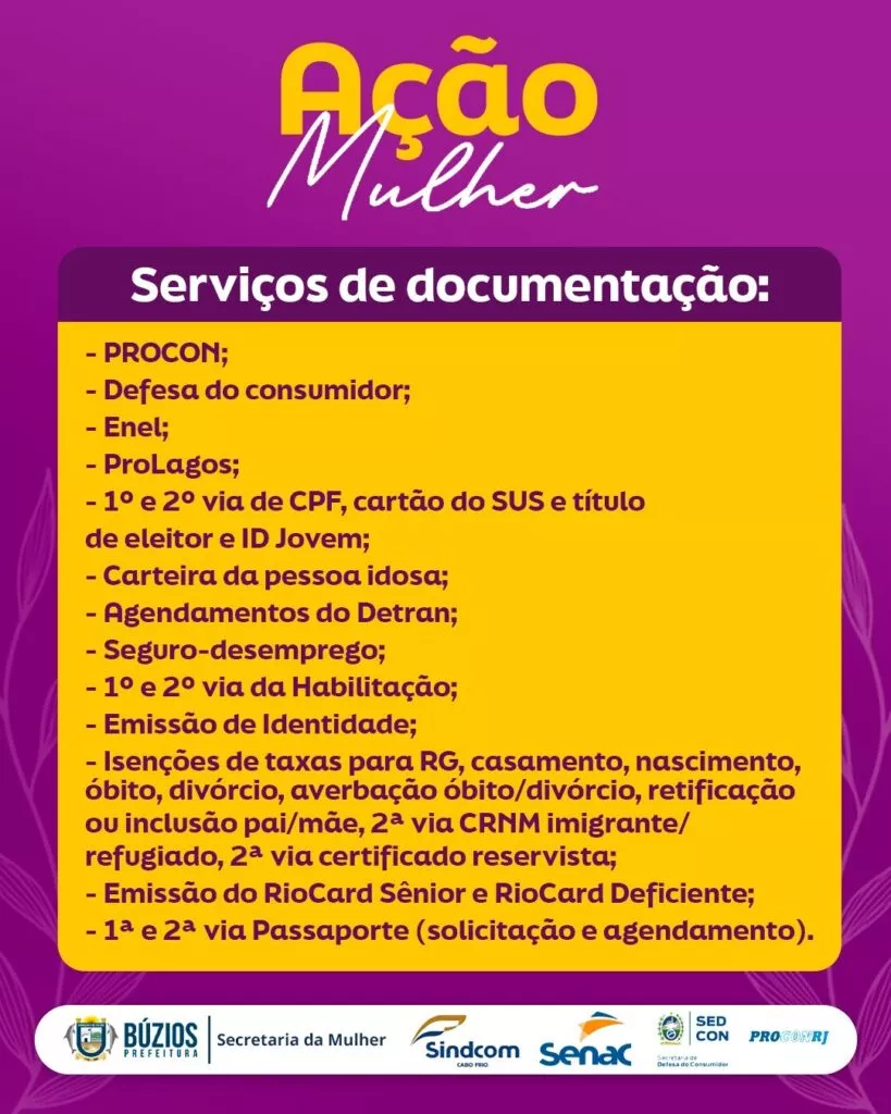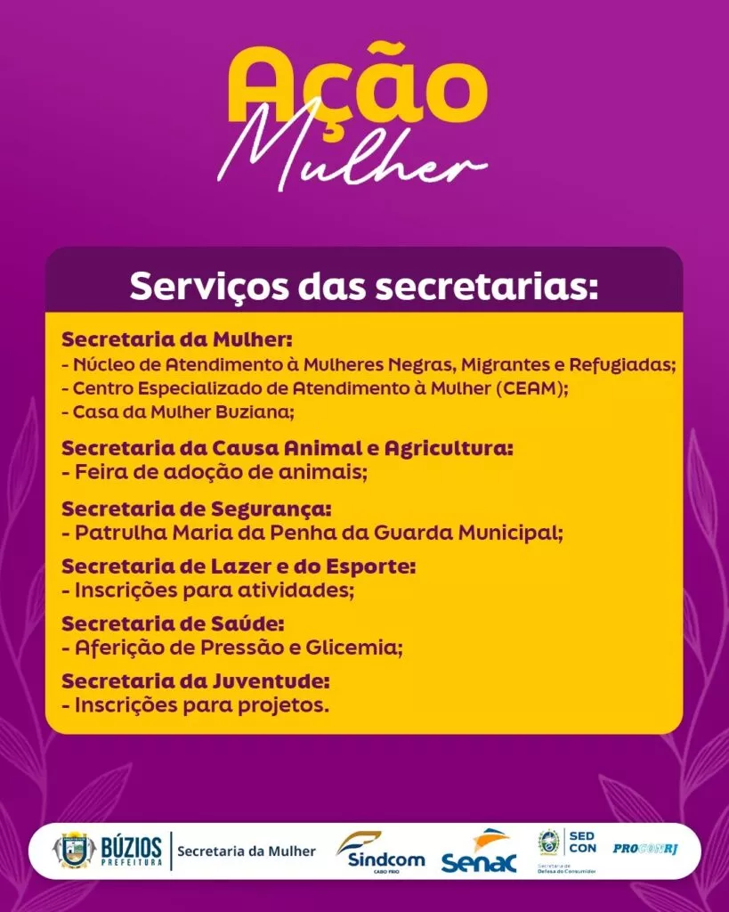 A Prefeitura de Búzios, por meio da Secretaria da Mulher, promove nesta quarta-feira, dia 17 de setembro, das 9h às 16h, a Ação Mulher, um grande evento que reunirá, em um só espaço, mais de 20 serviços gratuitos para a população. A iniciativa acontece na Praça Dona Uia (INEFI) e tem como objetivo aproximar os serviços públicos dos cidadãos, facilitando o acesso a direitos básicos, orientações e atendimentos em diversas áreas.