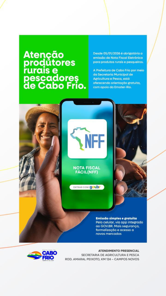 A Prefeitura de Cabo Frio, por meio da Secretaria Municipal de Agricultura e Pesca, iniciou um trabalho de orientação e apoio aos produtores rurais e pescadores do município quanto ao acesso e à utilização do sistema eletrônico de emissão de notas fiscais, conhecido como Nota Fiscal Fácil (NFF).