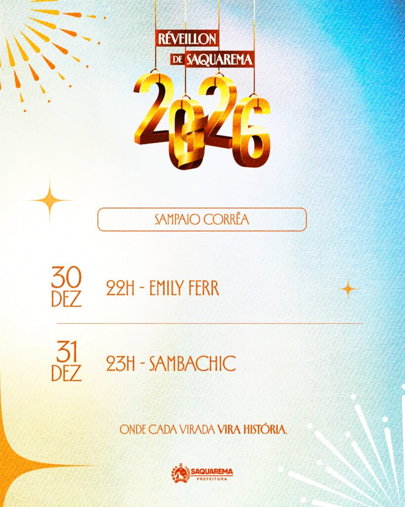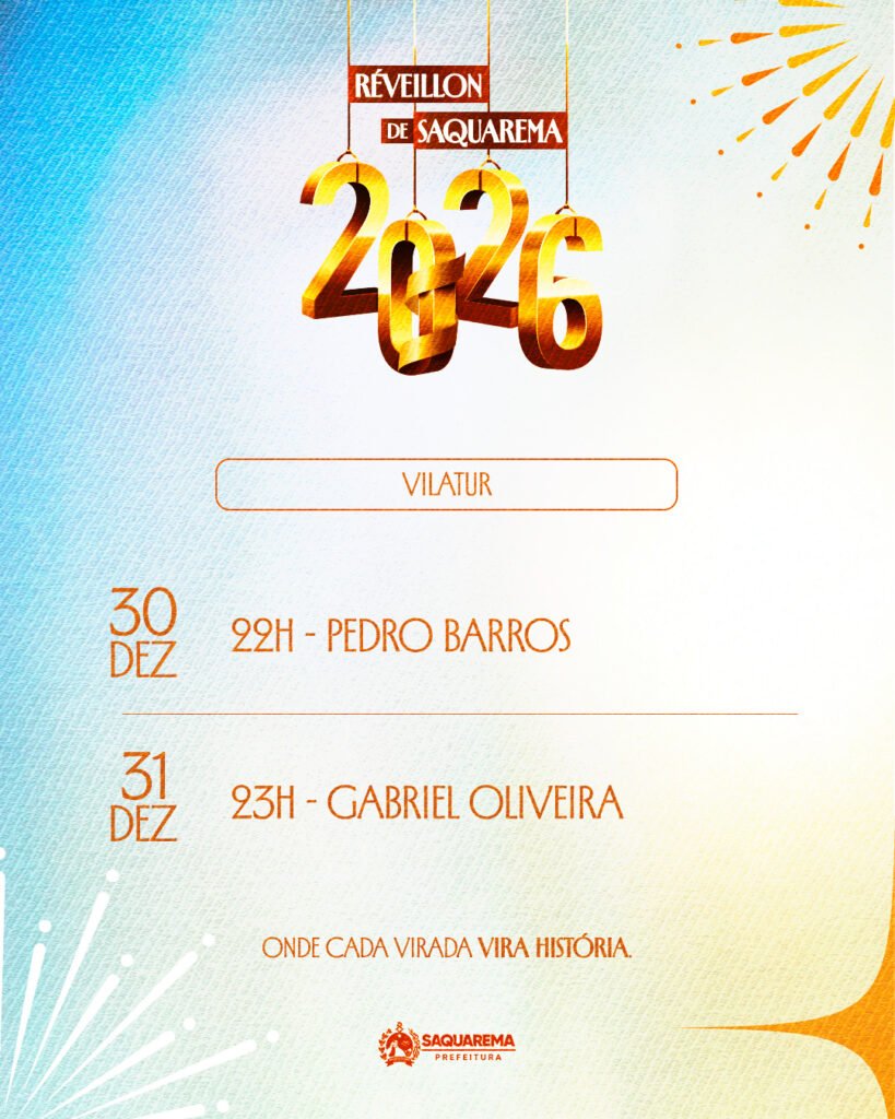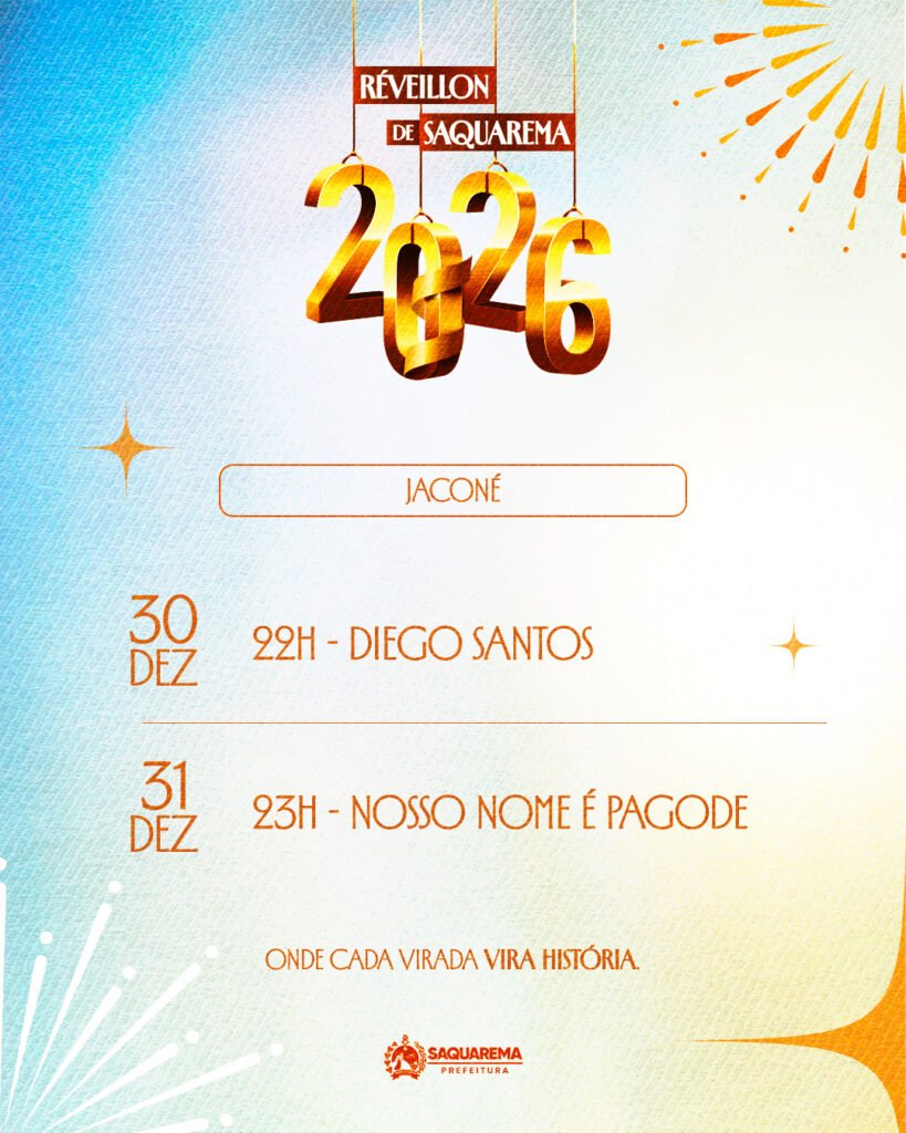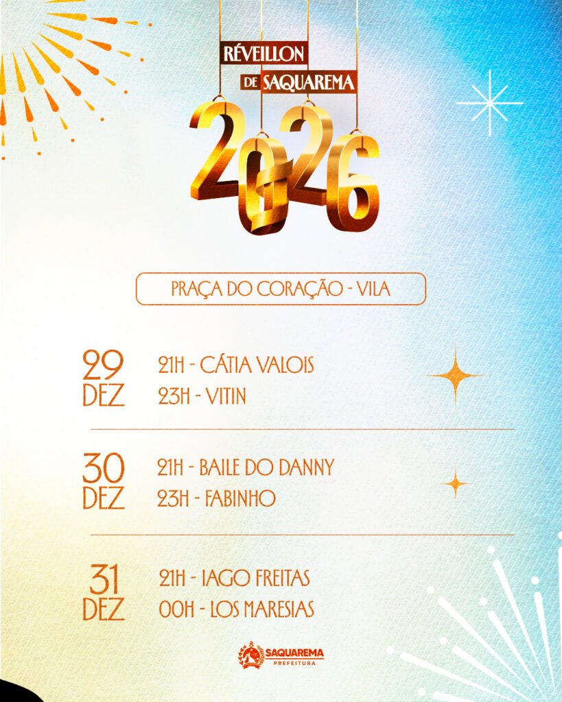 A Prefeitura de Saquarema, por meio da Secretaria Municipal de Esporte, Lazer e Turismo, preparou uma linda festa para celebrar a chegada de 2026. Com eventos em diversos bairros, a programação terá início no dia 29 de dezembro. Além da tradicional queima de fogos, quatro palcos serão montados no Centro, Jaconé, Vilatur e Sampaio Corrêa. Nestes locais, diversos shows animarão ainda mais a virada de ano em Saquarema.