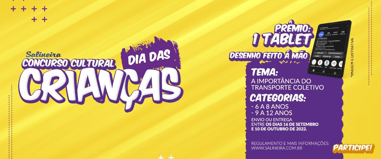 Começa hoje, 16, a promoção para o concurso cultural que a Auto Viação Salineira preparou para o Dia das Crianças. O concurso acontecerá até o dia 10 de outubro de 2022 e o resultado será divulgado pela empresa no dia 13 de outubro, tendo como prêmios 04 tablets para crianças que serão divididas em duas faixas etárias: de 06 a 08 anos e de 09 a 12 anos. Serão feitos desenhos com o tema: “A importância do Transporte Coletivo” por crianças que terão a oportunidade de usar toda a imaginação e os conhecimentos sobre o assunto.