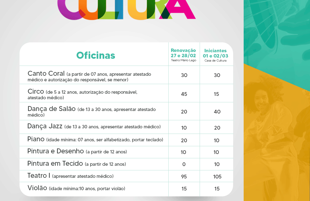 Para concorrer às vagas das Oficinas de Artes, o candidato deverá se inscrever, com preenchimento de Formulário e entrega de documentos no período de 27/02 a 01/03/2023, e as aulas terão início em 13/03. Para renovação, os alunos deverão se dirigir ao Teatro Municipal Mário Lago nos dias 27 e 28 de fevereiro. Já para os iniciantes, as inscrições deverão ser realizadas na Casa de Cultura Walmir Ayala, nos dias 01 e 02 de março.