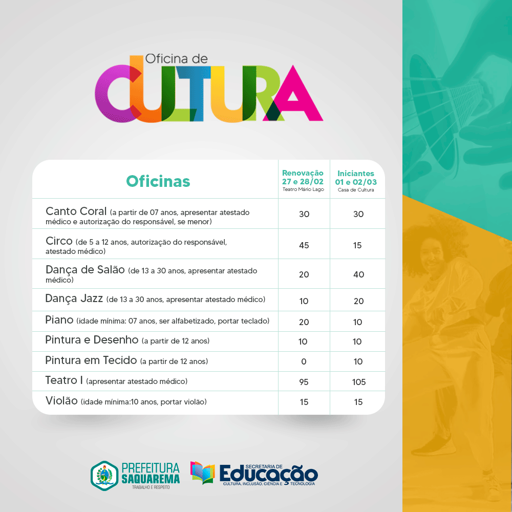 O município de Saquarema, por meio da Secretaria Municipal de Educação, Cultura, Inclusão, Ciência e Tecnologia, está oferecendo quase 300 vagas nas Oficinas de Artes para os moradores da cidade. Gratuitas, as oficinas terão aulas presenciais em vários horários, e visam a capacitar jovens e adultos para diversas modalidades das Artes Culturais.