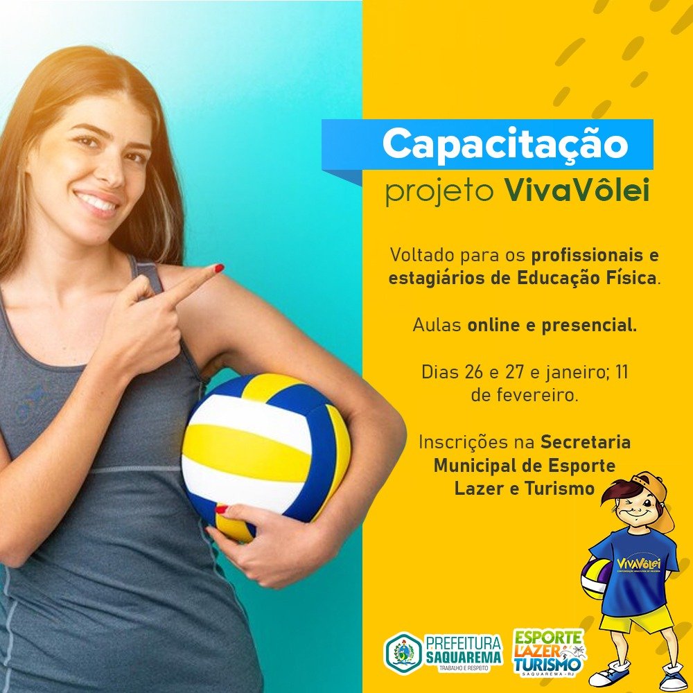 O município de Saquarema, por meio da Secretaria Municipal de Esporte, Lazer e Turismo e em parceria com a Confederação Brasileira de Vôlei, realizará uma capacitação para o projeto VivaVôlei. De forma híbrida, as aulas ocorrerão nos dias 26 e 27 de janeiro, das 16 às 20 horas, na modalidade on-line; e 11 de fevereiro na modalidade presencial, das 08 às 13 horas.
