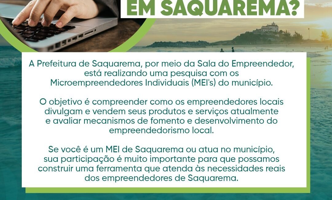 A Prefeitura de Saquarema, por meio da Sala do Empreendedor e da Secretaria Municipal de Governança e Sustentabilidade, está realizando uma pesquisa inédita voltada aos Microempreendedores Individuais (MEIs) do município. O objetivo é compreender de que forma os empreendedores locais divulgam e comercializam seus produtos e serviços, além de identificar...