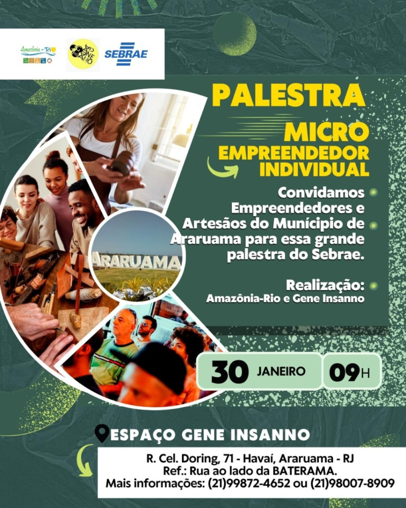 O Sebrae, em parceria com a Amazônia-Rio e o Gene Insanno, vão realizar a palestra “Micro Empreendedor Individual” na próxima segunda-feira, dia 30, às 9h. O evento é gratuito e destinado aos empreendedores e artesãos de Araruama e região.