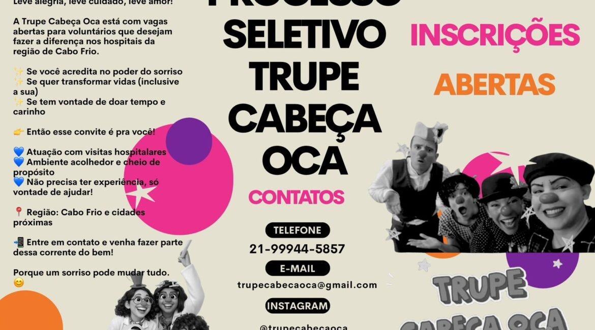 A Trupe Cabeça Oca está com inscrições abertas para novos voluntários interessados em levar alegria e acolhimento a hospitais da região de Cabo Frio. A iniciativa busca pessoas dispostas a doar tempo e carinho por meio de visitas hospitalares, promovendo bem-estar emocional a pacientes e profissionais de saúde.
